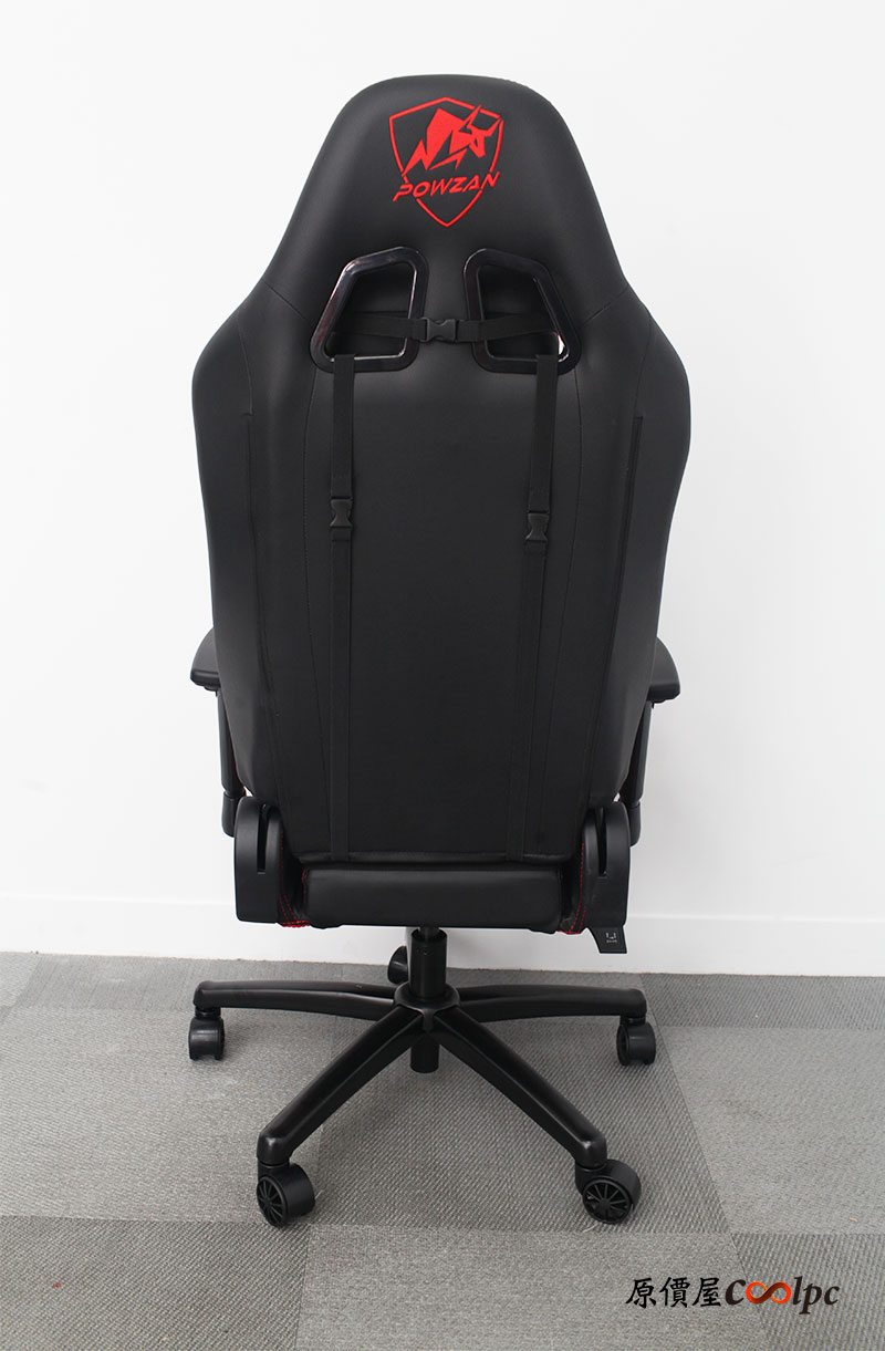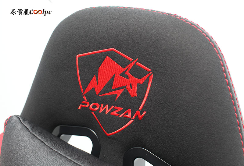 椅背靠頭的位置有一個POWZAN LOGO,用了招牌的紅色加上車縫圖樣及字體。