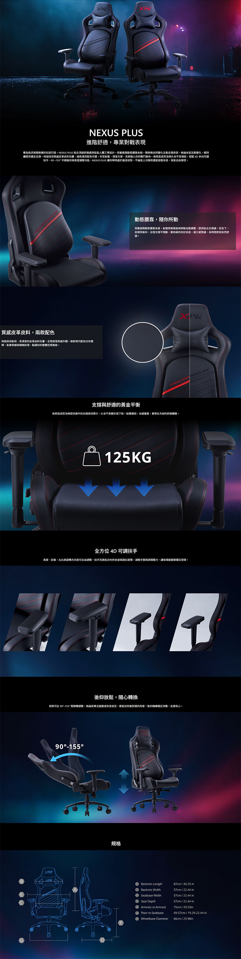 這次主角「XPG NEXUS / NEXUS PLUS 」是專為長時間戰鬥的玩家打造的專業電競椅。擁有人體工學支撐設計,符合脊椎曲線,從頭到腰給你滿滿的支撐感,玩再久也不會變成鐘樓怪人XD。另外還有 4D 扶手(NEXUS 為 2D 扶手)的配置,讓你輕鬆調整前後、左右、上下的角度,想放輕鬆還是呈現備戰狀態都能穩穩配合。而多段式的後仰結構也讓你能自由的切換調整為 90° 專注開戰、155° 放鬆耍廢模式,你只需輕輕的一拉!就能改變你現在的乘坐狀態。另外也加入了高密度的泡棉坐墊,柔軟且不塌陷,彈性回饋也讓你每一坐都是 VIP 等級的享受!最後還有金屬五爪底座與高承重氣壓棒為基底,最高承重 125kg 的實力,讓你坐起來就是穩如戰車,不怕長時間戰鬥以及戰況激烈帶來的久坐不安感。當然這次兩款電競椅在椅面材質上也有不同,「XPG NEXUS」為柔軟的防潑水布料,而「XPG NEXUS PLUS」更是使用了質感皮革料來做包覆。後者也有更進一步的升級,用料厚實、支撐也更全面~就看各位玩家追求的是什麼了。快趁這次新品上市活動給它買起來~限量「XPG 抱枕毯+威剛外接式 SSD SC750 1TB」超值雙好禮送完就沒有囉!
