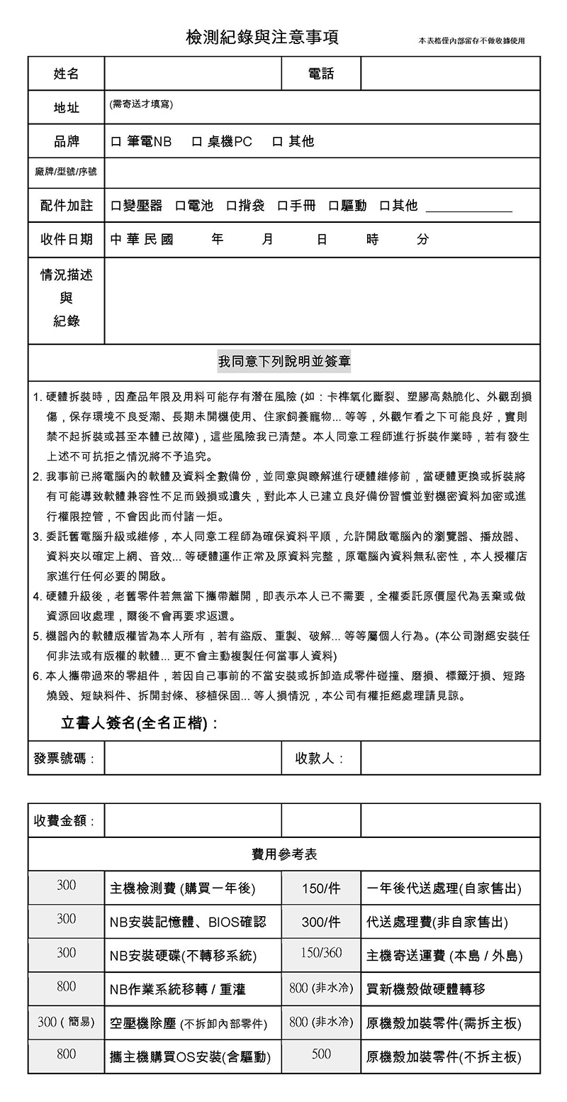 一年過後主機檢測費 -> 一件NT.300