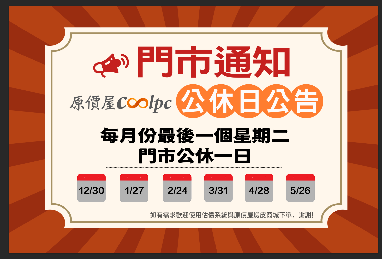 【公告】12/30(二)原價屋實體門市公休日。
