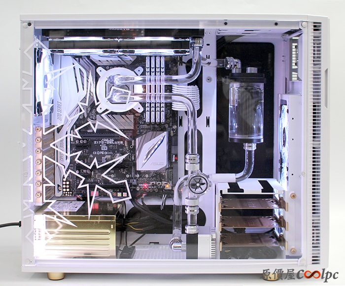 絕無僅有的原價屋職人手作新品再添一枚!以雪白色搭配金色飾件點綴的Fractal Design R5 靜音機殼打造,給人寧靜浪漫的感覺,為了維持這股氛圍,在零組件的挑選上也特別選用同色系的單品作搭配,並採用無色透明水冷液及白光風扇呈現出片片雪花在機殼中環繞的效果,最終定名為「冰雪奇顏」