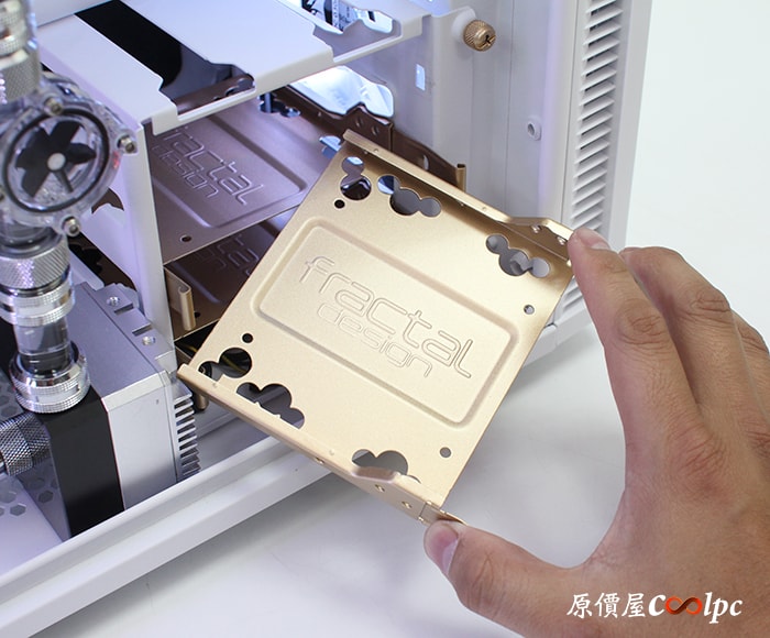 採用Fractal Design R5 冰金白機殼,純白機身搭配香檳金的飾件配色讓整咖機殼看起來相當高雅大方,而這次更使用原廠提供的磁吸式透側板,讓水冷配備能夠以更完整的面貌展現給大家,同時這片側板上還有雪花圖騰,看起來多了一絲趣味。