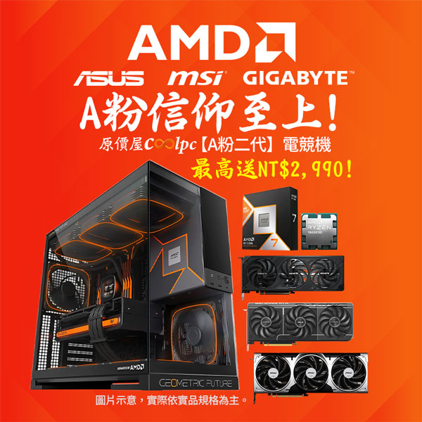 專為 AMD 忠實信徒打造的信仰主機「A粉二代」登場!集結華碩、微星、技嘉三大廠牌強力支援,玩家可自由選擇喜愛的廠牌方案,全系列延續使用視覺張力的 AMD 聯名款機殼(幾何未來 Model 5 悟空),透明側板加上經典 AMD Ryzen 配色,硬體與視覺完美呈現!這次「A粉二代」電競主機,獻上AMD 最強 X3D 系列處理器與 NVIDIA GEFORCE RTX 50 系列顯卡結合,絕對是遊戲玩家的夢幻配備呀。原價屋也準備了各式電競好禮回饋給 A 粉們!有機械式鍵盤 / 電競滑鼠 / 螢幕掛燈 / M.2 SSD 外接盒(最高賺 NT$2,990),指定 CPU & GPU 官網還能索取數位遊戲,最高爽賺三套遊戲(總價值$5670),本檔活動為蝦皮限定,有興趣的朋友趕緊到原價屋蝦皮商城下單囉!
